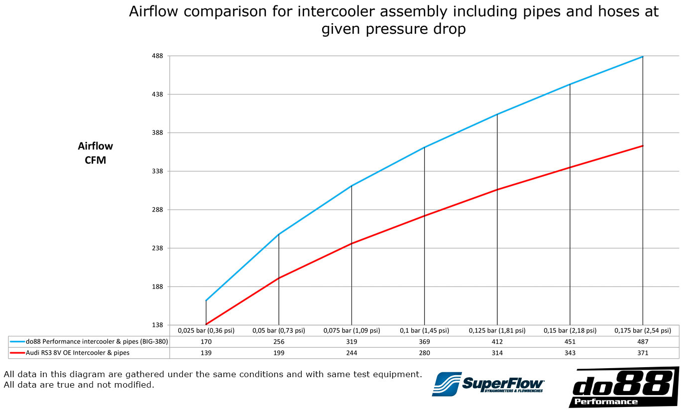 The included do88 charge pipe kit is designed to complement and improve the performance of the do88 Performance Intercooler. The OEM charge pipes have several inefficient bends and do not have a performance-optimized design. Our charge pipes is both significantly larger and fully flow-optimized, making it flow 31% more than the OEM!
