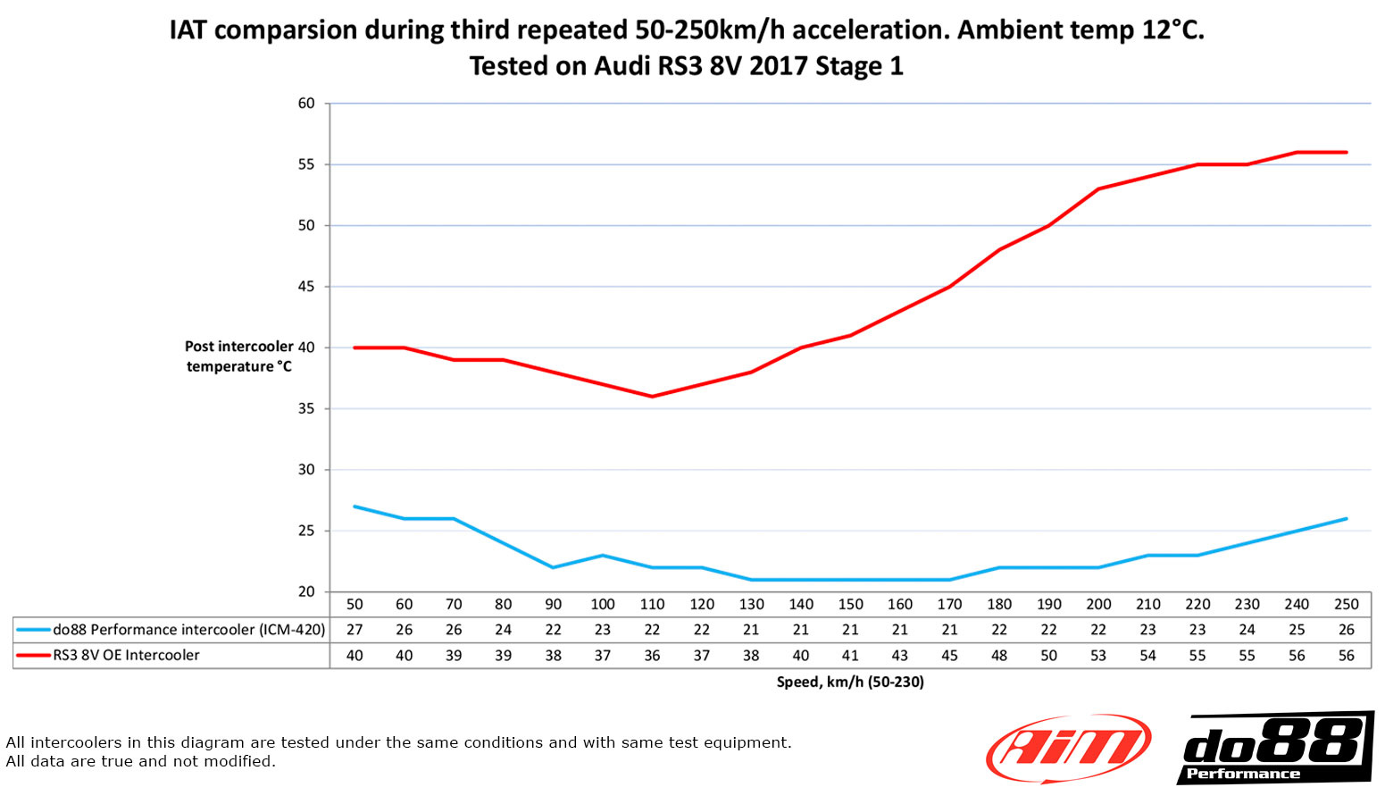 - Lower inlet air temperature under identical conditions: 23°C compared to OEM 55°C. Impressive 32°C lower! Exact figures to be found in the diagrams under product pictures.