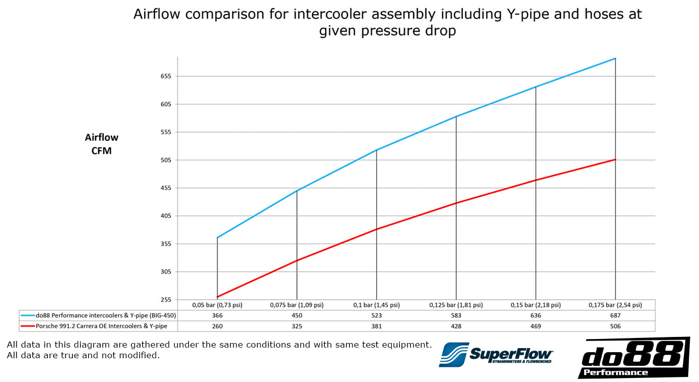 Cooling is important, and so is airflow. After many hours of development, refining the end tanks and choosing a core to meet our demand, the result is an intercooler that is much more efficient in terms of heat transfer as well as airflow. Using our in-house Superflow SF-1020 Probench, the airflow is verified as a complete system, with hoses on both inlet and outlet, for both the OEM 991 intercoolers, and the do88 performance intercoolers.