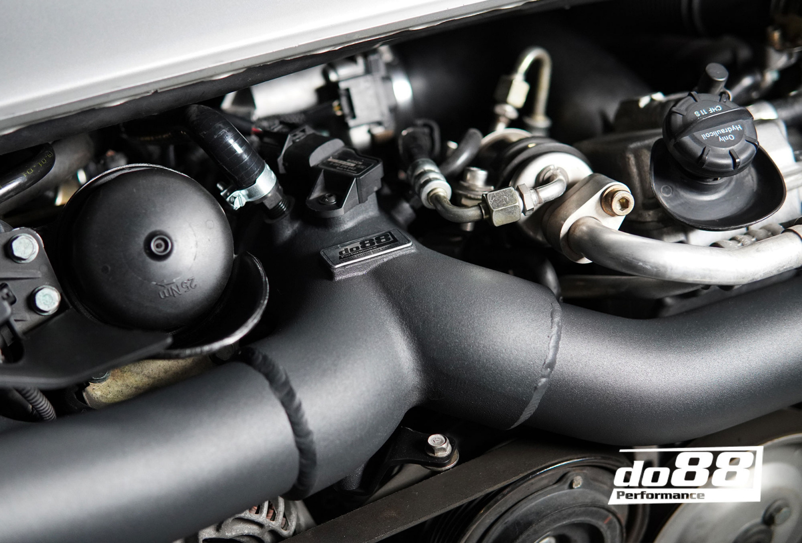 To maximize cooling, these air guides are equipped with seals against both the charge air cooler and bodywork, to ensure that the cooling air does not take the easier routes around the core. The intercooler connections are a full 70mm (2 3/4") to maximize flow and eliminate any bottlenecks in the system. This means that this kit comes with new hoses at all four positions, all designed and CFD-tested for optimal flow. The hoses at the turbocharger outlet are made of material with especially high heat resistance, rated for a constant temperature of 240°C.