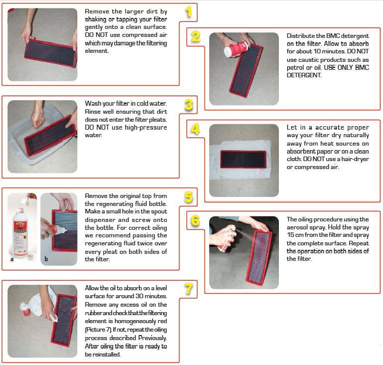 The detergent removes the existing particle build up and residue leaving a prime cotton filter ready for the BMC regeneration fluid (filter oil). Filter cleaning is recommended every 24000km (15000 miles) (depending on usage and local conditions) to maintain top filtration.