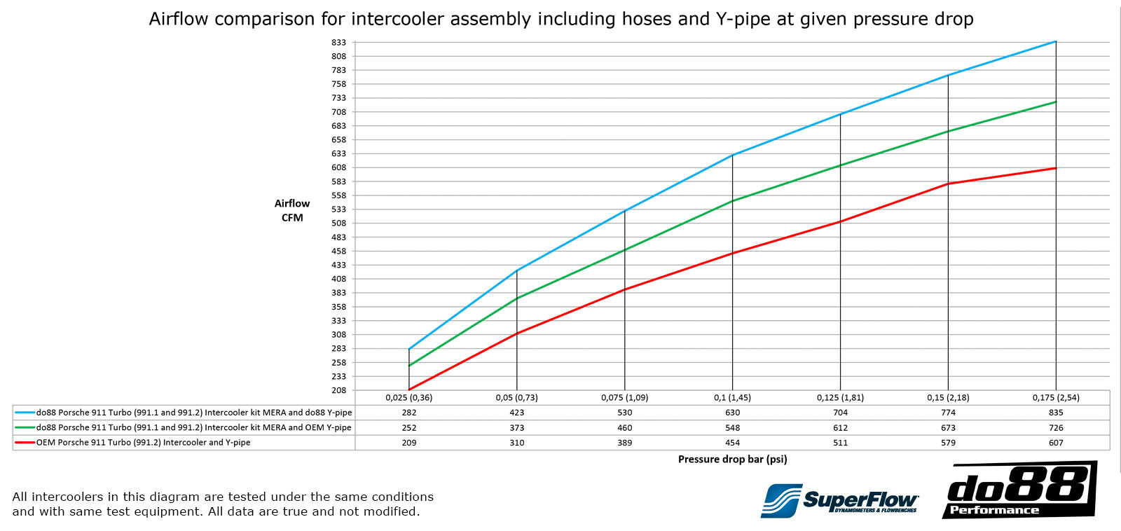 - More air to your engine, less backpressure and better airflow! Airflow at 0,175 bar / 2,54 psi pressure drop: 726 CFM (607 CFM), 19 % higher (do88 intercoolers + OE y-pipe vs OE intercooler + OE y-pipe)! See diagram below.