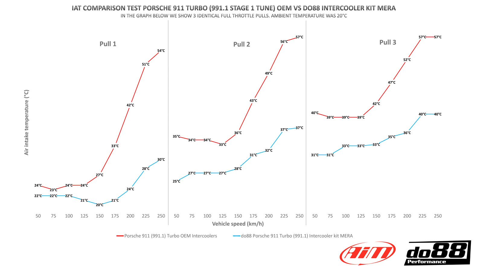 When it comes down to performance, the do88 intercoolers significantly reduce the intake temperature! In the graph below the difference towards the OEM 991 units is presented. The data is collected with an AIM race logger under 5 consecutive runs in an immediate sequence. Full throttle accelerations between 50-250 km/h (30-155 mph) in a Stage 1 tuned Porsche 991. No cooldown in between, just full pull. During every test, the car was driven in Sport Plus, AC off.