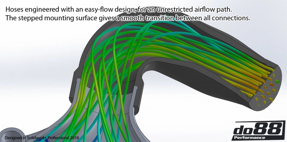 The core is new, but the end tanks and all accessories are the same as before. The intercoolers feature cast end tanks that distribute the airflow over the full core in a very precise way. This is very important as a good tank design will be beneficial for both pressure drop and cooling efficiency. To be able to fit an intercooler with appropriate thickness for the job, it was also necessary to design a new upper ambient air guide. This was designed in our 3D-scanned environment to ensure perfect fitment to the vehicle-integrated air guides, as well as the intercooler. To further remove bottlenecks, the intercooler kit MERA has intercooler connections that are 70 mm (2 3/4 inch) to really allow for the air to pass without restriction. This also means that there are new hoses included for each position, of which all are 3D-designed with maximum airflow in mind. All hoses are CFD-tested to ensure this. The hoses on the turbo outlet are made from a high-temp spec. material, rated to 240°C (464°F) continuous temperature. In order to really take advantage of all the heat-transferring ambient air, the carbon ducts come with proper seals towards the body, forcing all of the air to pass through the core, and not escape around it.
