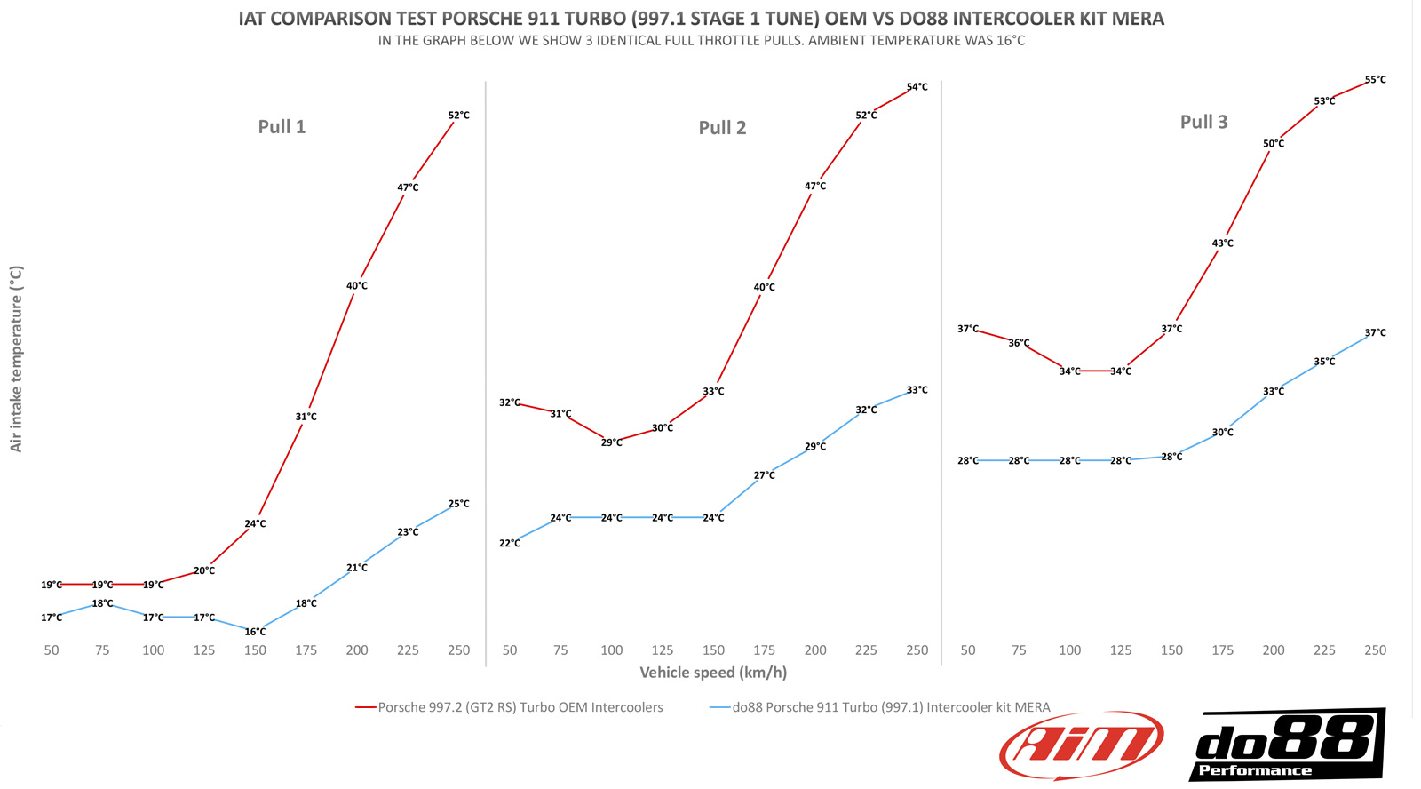 When it comes down to performance, the do88 intercoolers significantly reduce the intake temperature! In the graph below the difference towards the OEM 997.2 units is presented. The data is collected with an AIM race logger under 5 consecutive runs in an immediate sequence. Full throttle accelerations between 50-250 km/h (30-155 mph) in a Stage 1 tuned Porsche 997. No cooldown in between, just full pull. During every test, the car was driven in Sport Plus, AC off.