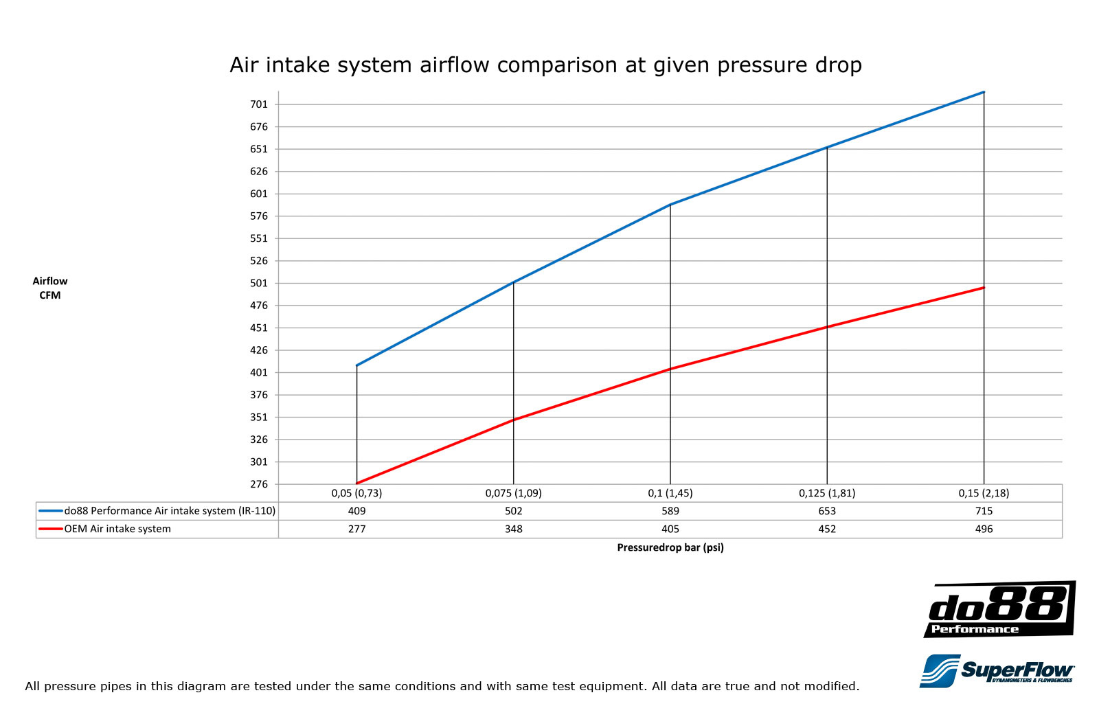 do88 turbo inlet pipe has an air flow at 0,125bar/1,81psi pressure drop of 653CFM, compared to the OEM pipe and air box that has 452CFM!