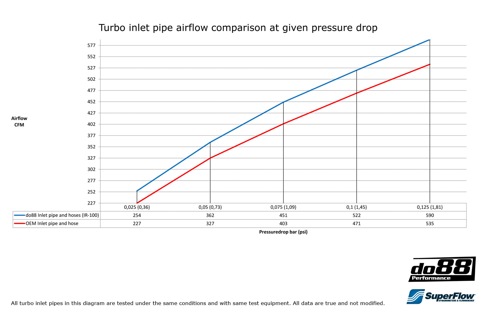 This kit is for you that has high horsepower goal and want to upgrade to the absolute best! Our turbo inlet pipe has better air flow than the stock pipe. This is verified by our own SuperFlow SF-1020 flow bench. Our turbo intake pipe is 89mm (3,5 inch), outer diameter, all the way to eliminate all restrictions.